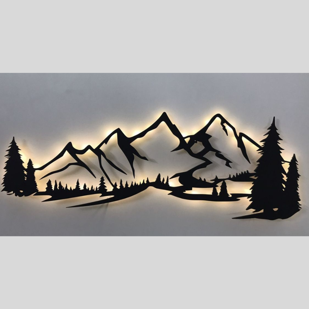 Impresionante mural en metal con silueta de montañas, árboles y camino, realzado con iluminación LED posterior. Ideal para crear un ambiente cálido y natural en salas, oficinas o espacios de descanso. Diseño moderno y elegante que transmite tranquilidad y conexión con la naturaleza.